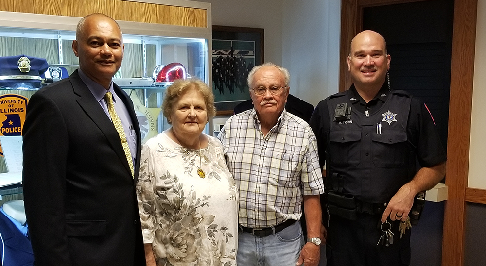 URBANA, Ill. – Thanks to a generous donation from Jim and Barb Esworthy of the Journey Foundation, the University of Illinois Police Department is moving toward equipping all of its officers with body cameras. On Friday, the Esworthys presented to the police department a $6,000 check, which will go toward converting the department’s existing squad-car camera and video management systems to the same system that the body cameras will run on. Converting everything to the same system will allow the department’s squad car cameras have a wider range of view, and it will make the management of video and associated [...]